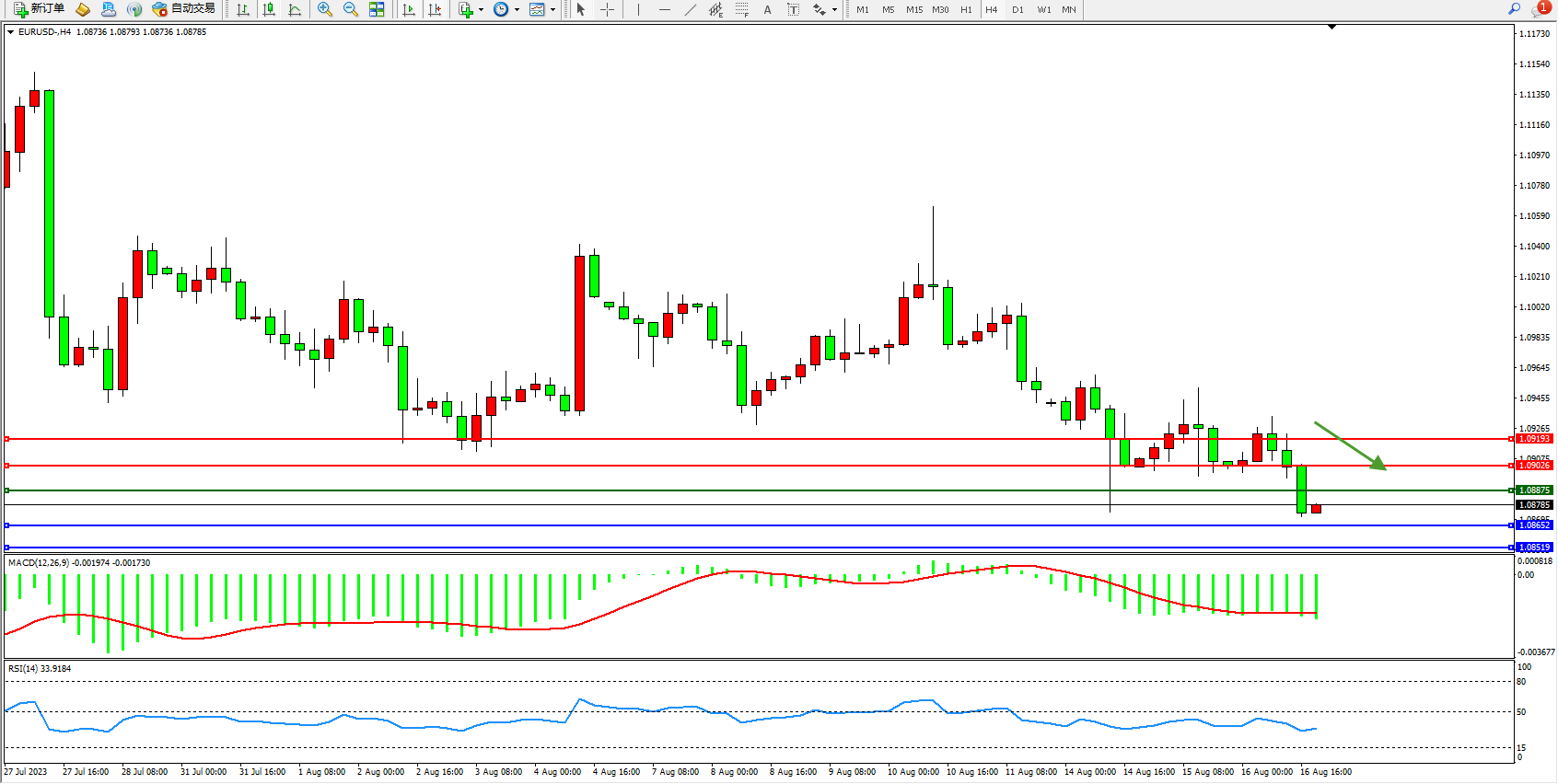 4小时图看:市场空头情绪持续震荡下行,短期跌势持续,市场空头趋势依旧,MACD指标处于空头区域维持整理,RSI指标处于空头区域维持徘徊;