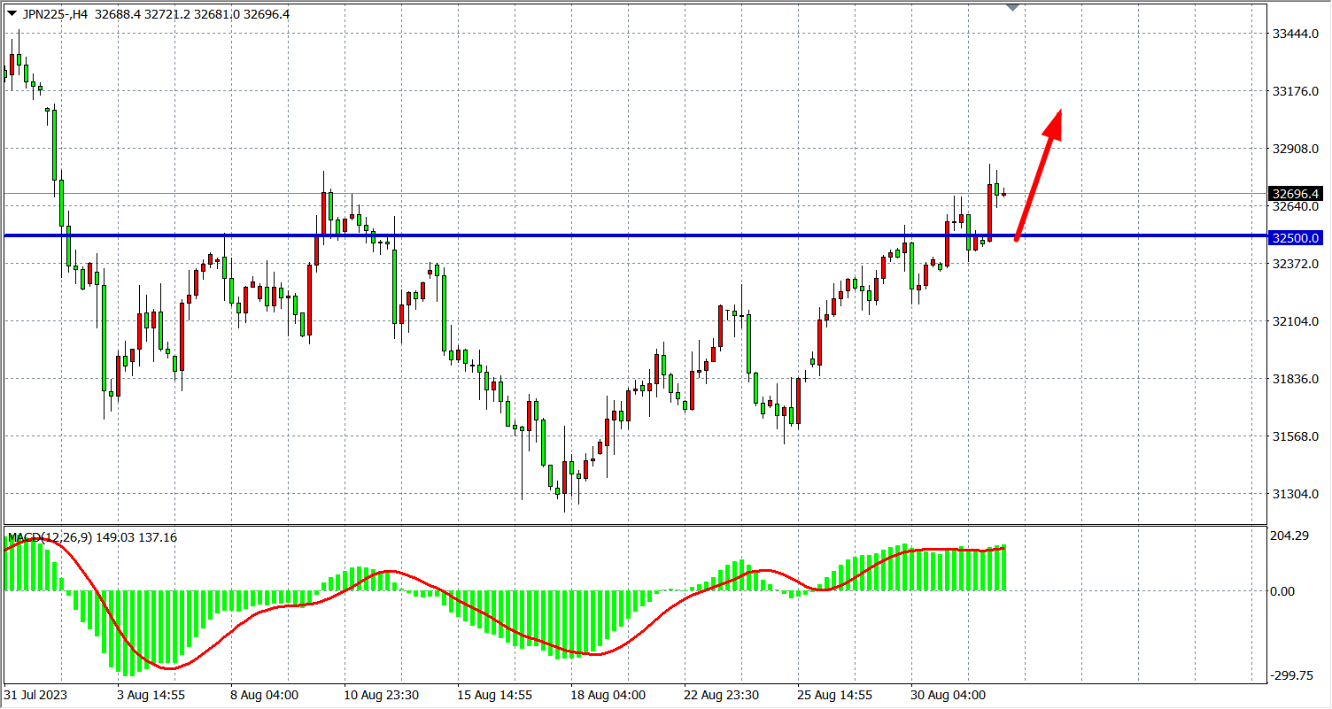 周五(9月1日)日经225指数收盘上涨135.00点,涨幅0.41%,报32727.50点