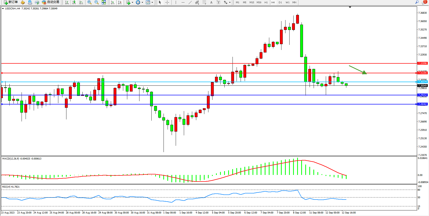 交易策略:7.30379下方看跌,目标7.29152 7.28302