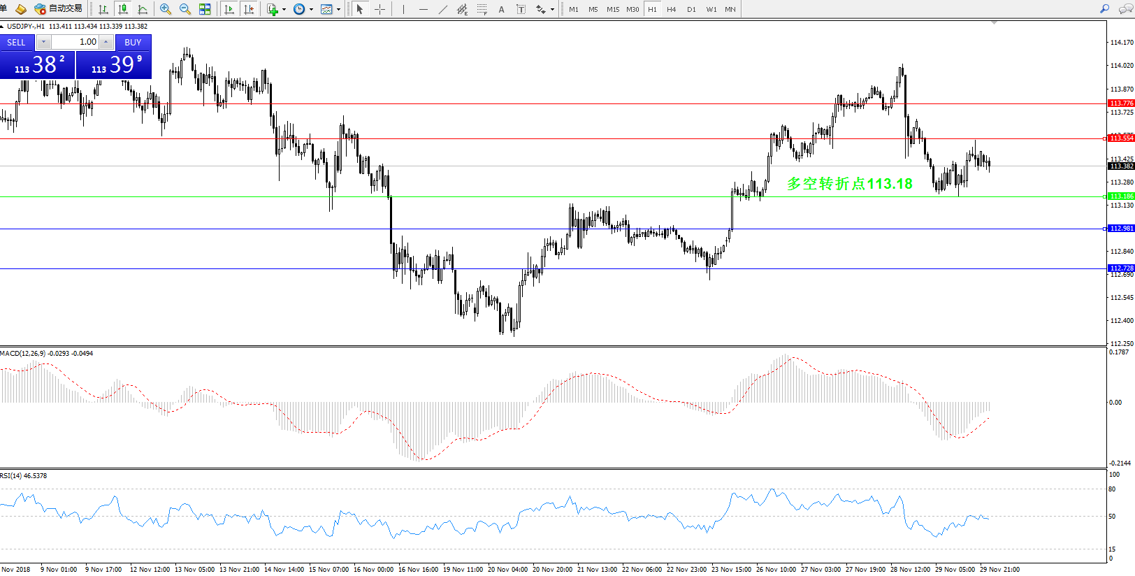 交易策略:倾向于高位做空,破位113.18伺机空单进场,目标112.7位置;
