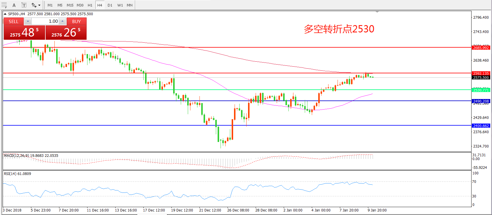 4小时图看,SP500站2490后强势上行,均线系统有拐头迹象,MACD红柱增加,RSI指标出现拐头,短期反弹概率较大。