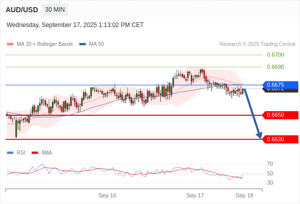 在 0.6675 之下,看跌,目标价位为 0.6650 ,然后为 0.6630 。