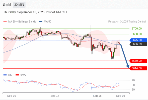 黄金现货 当日内: 短期关键阻力位在3675.00。