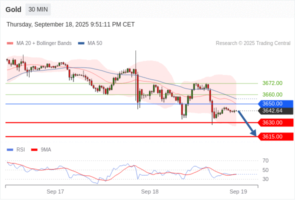 在 3650.00 之下,看跌,目标价位为 3630.00 ,然后为 3615.00 。