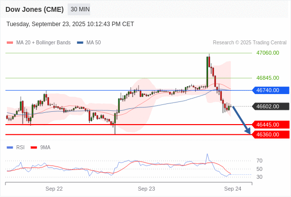 在 46740.00 之下,看跌,目标价位为 46445.00 ,然后为 46360.00 。