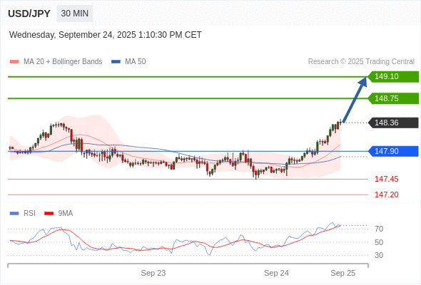 在 147.90 之上,看涨,目标价位为 148.75 ,然后为 149.10 。