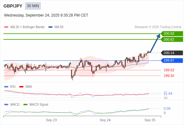 英镑/日元 当日内 : 看涨,当 199.87 为支撑位。