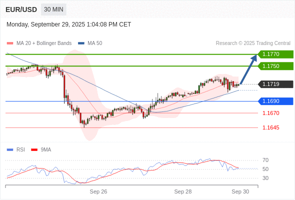 在 1.1690 之上,看涨,目标价位为 1.1750 ,然后为 1.1770 。