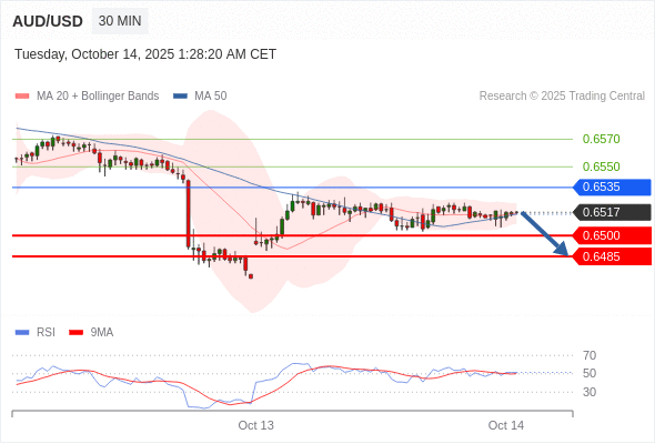 在 0.6535 之下,看跌,目标价位为 0.6500 ,然后为 0.6485 。