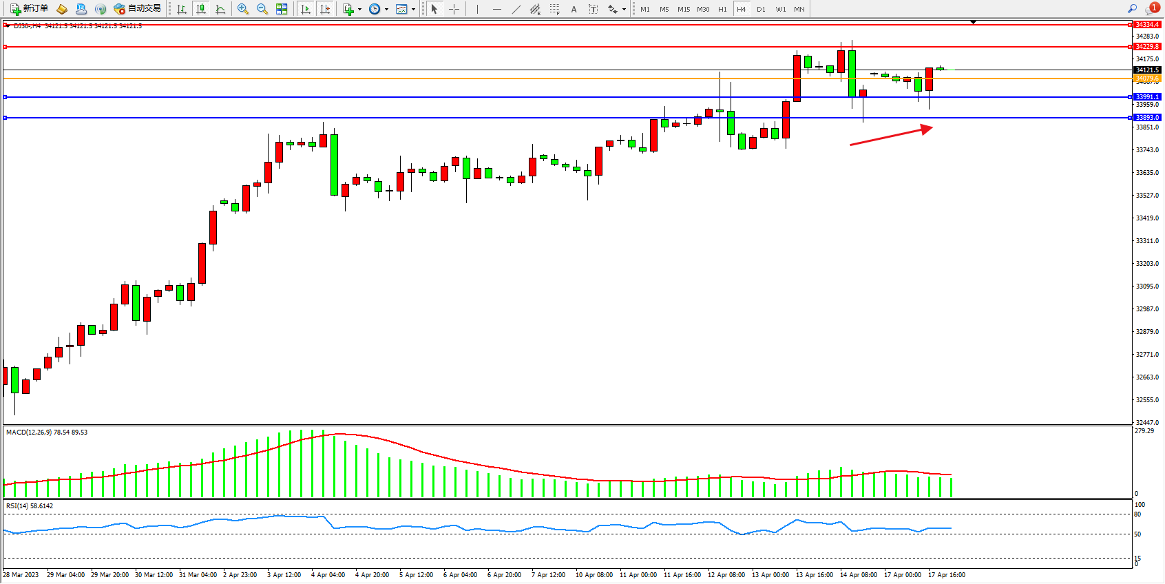 道琼斯指数4月17日(周一)收盘上涨100.90点,涨幅0.30%,报33987.37点;美国4月纽约联储制造业指数从3月的-24.6大幅升至10.8,为去年7月以来最高,超过了经济学家普遍预期的-15。