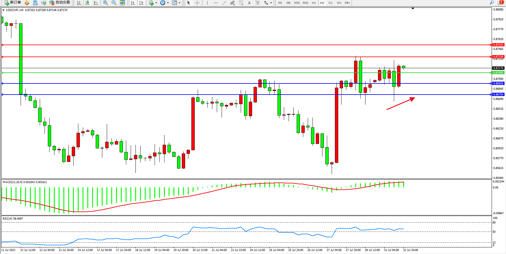 美元兑瑞郎维持0.87170附近震荡,交易商们押注,美国通胀削弱可能会抑制美联储进一步提高利率,看涨黄金的人们希望,欧洲央行等其他央行亦已差不多接近结束加息。