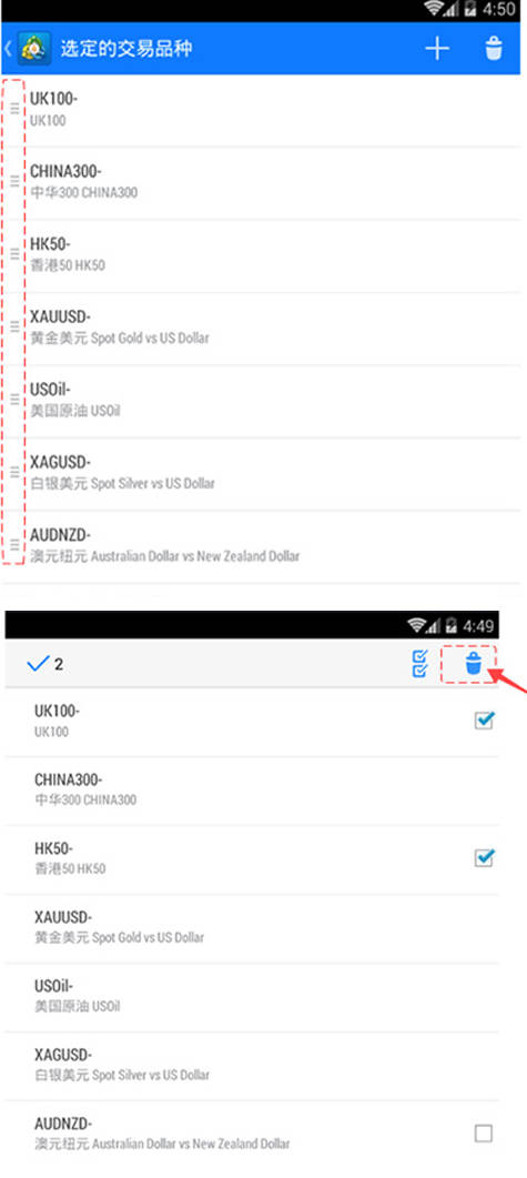 ●点击删除按钮,然后勾选商品后,点击右上角的删除按钮